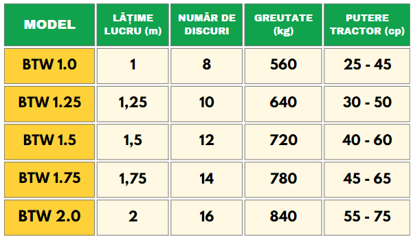 • Dispunere inversată a discurilor, concepută pentru a reduce semnificativ lățimea efectivă a mașinii